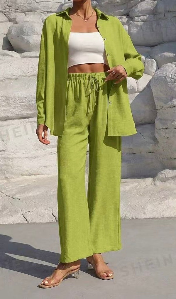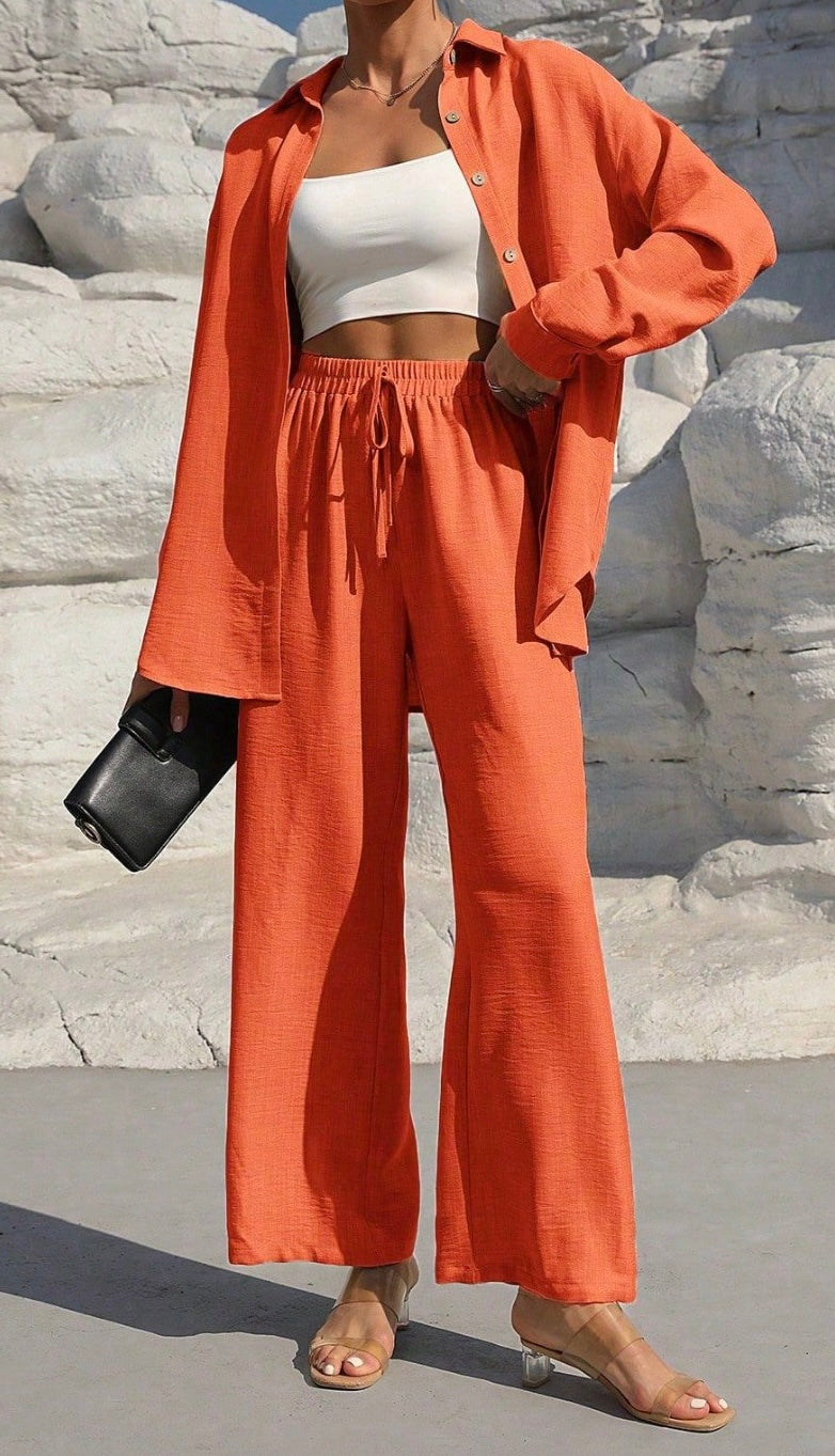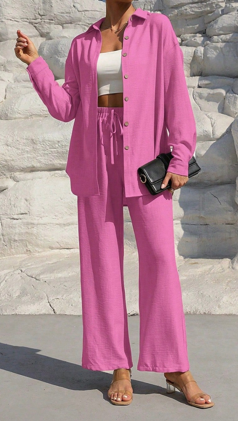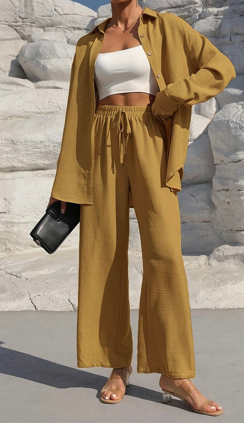 Effortlessly relaxed, endlessly wearable. The Luna Set is your go-to uniform for summer ease, blending soft tailoring with a laid-back silhouette. Designed in a breathable fabric with a fluid drape, the set features wide-leg drawstring trousers and an oversized button-down shirt—perfect for layering over a bralette or pairing with sleek accessories.